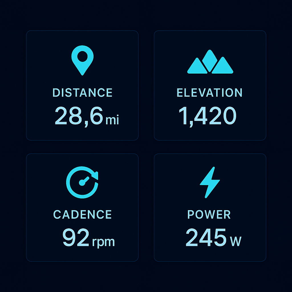 Concise, high-contrast cards that showcase distance, elevation, cadence, and power with cohesive branding.